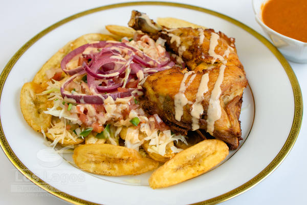 Chicken with tajadas, served with Cabbage Salad, Chimol, Sauce and Dressing