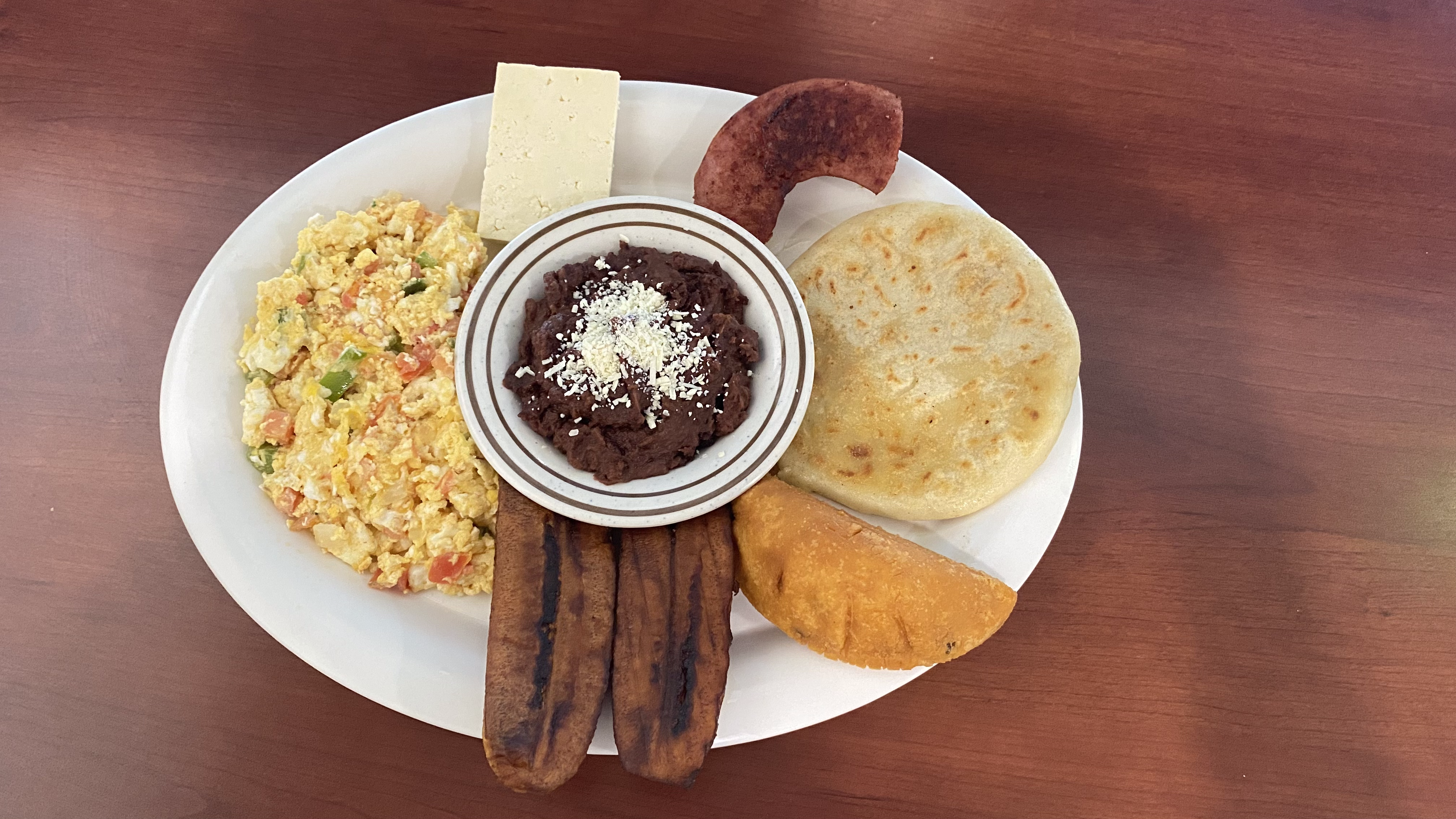 Eggs, Cheese, beans, cheese, fried pllantain, salchicha, pastelito y pupusa.