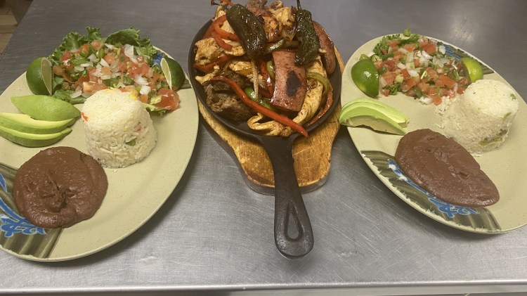 con Fajita,Pollo,Salchicha,Camarones Arroz, frijoles, pico de gallo y aguacate para dos personas